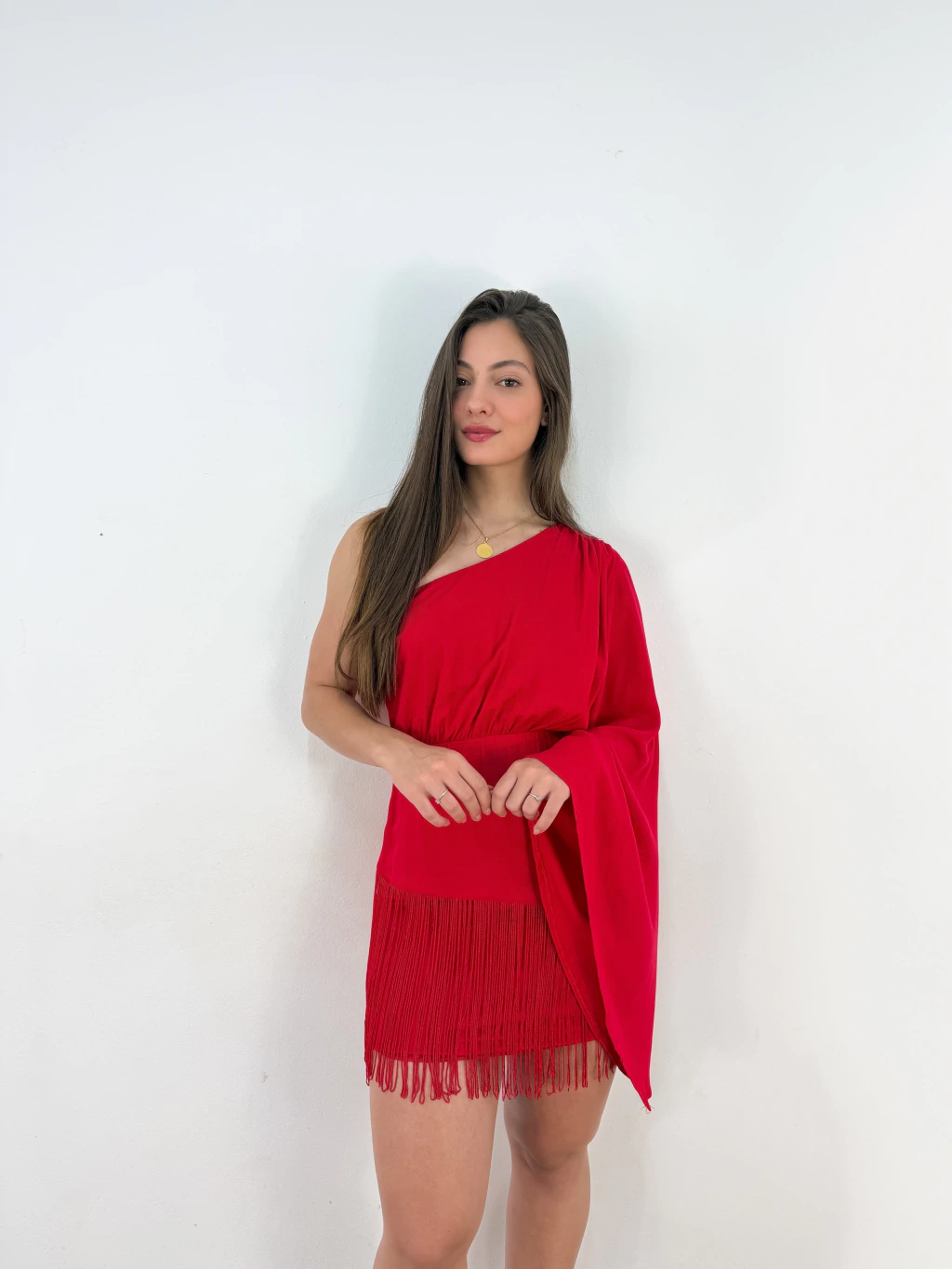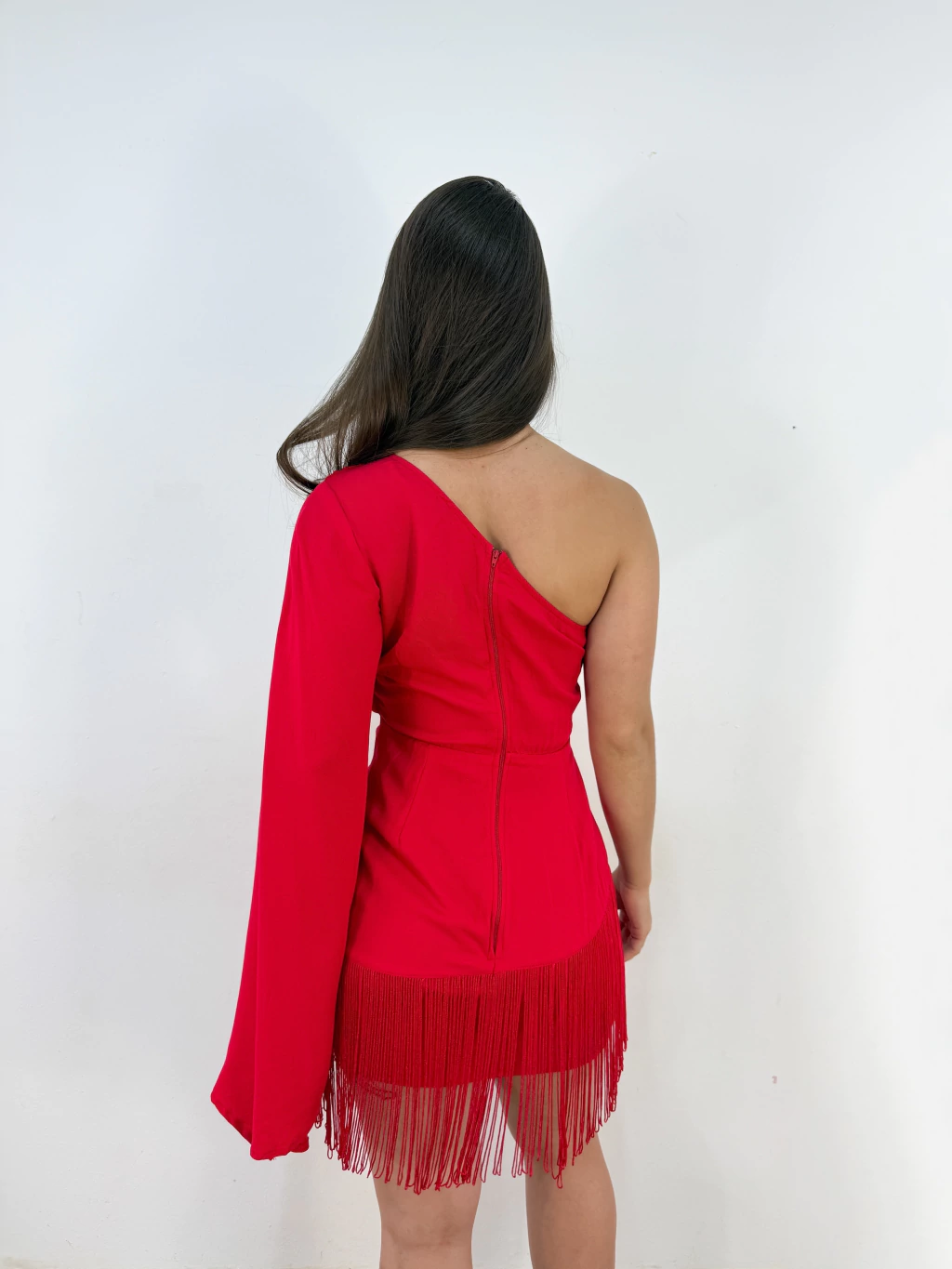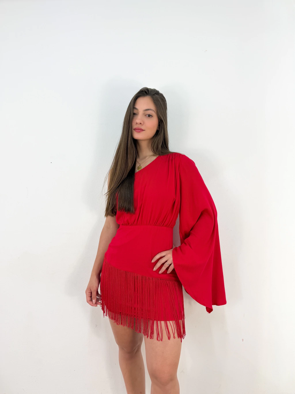 A cintura levemente marcada valoriza a silhueta, e a saia curta com franjas delicadas traz um toque moderno e sensual, criando um efeito dinâmico a cada passo.